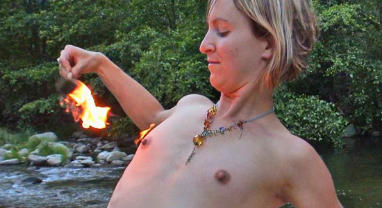 The fiery ends of her "poi" spin around making a rushing sound. Apollo and PoiToi also perform, demonstrating their own talent and style with live fire. Next, Jenni prepares her giant flaming hoola hoop, lighting all 14 flares. What an amazing sight so see all that hot fire spinning around her nude body.